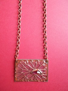 I work with a variety of materials, primarily sterling silver, fine silver and brass. Techniques I use include enameling, casting, hand fabriction.