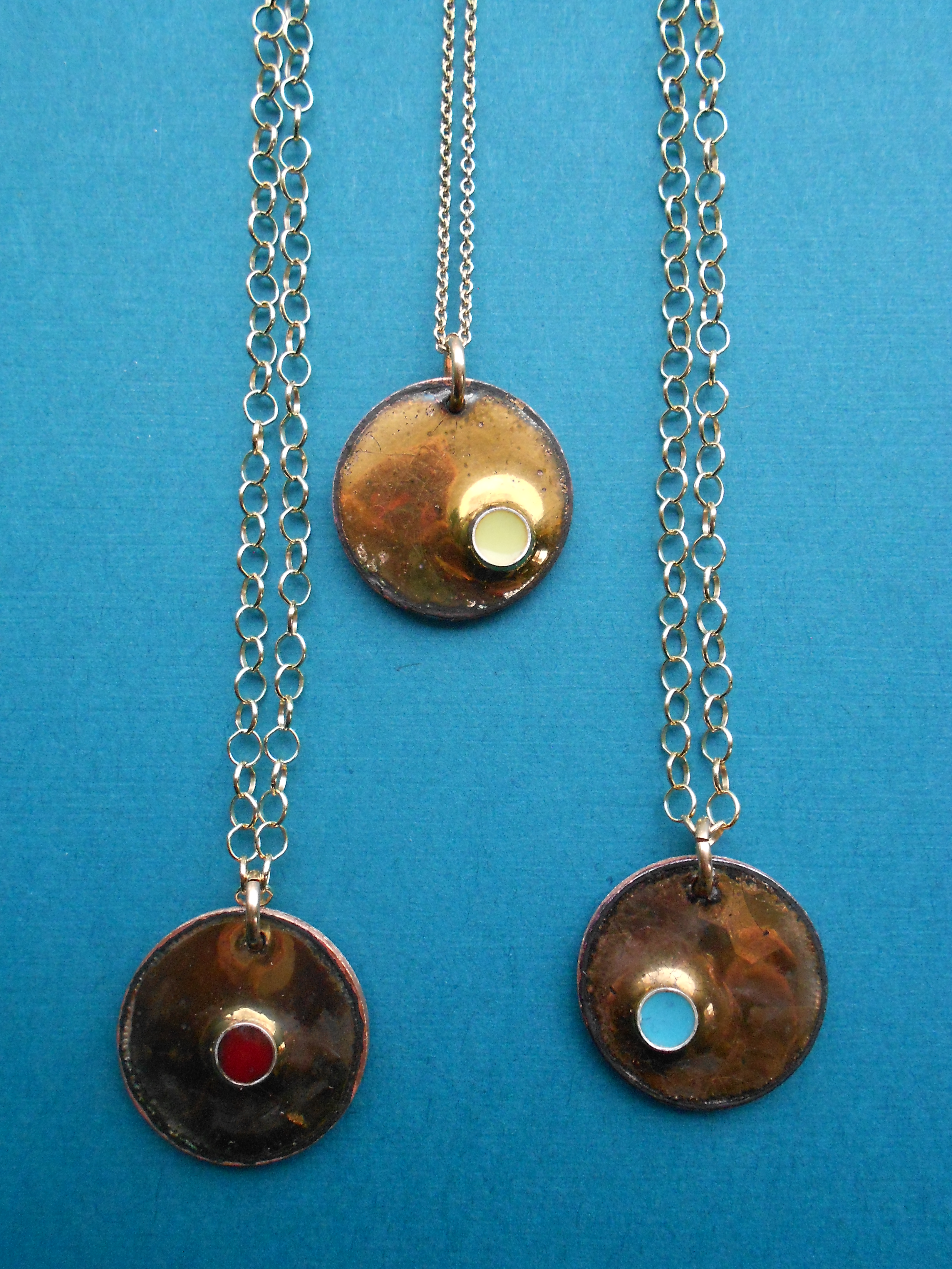 I work with a variety of materials, primarily sterling silver, fine silver and brass. Techniques I use include enameling, casting, hand fabriction.