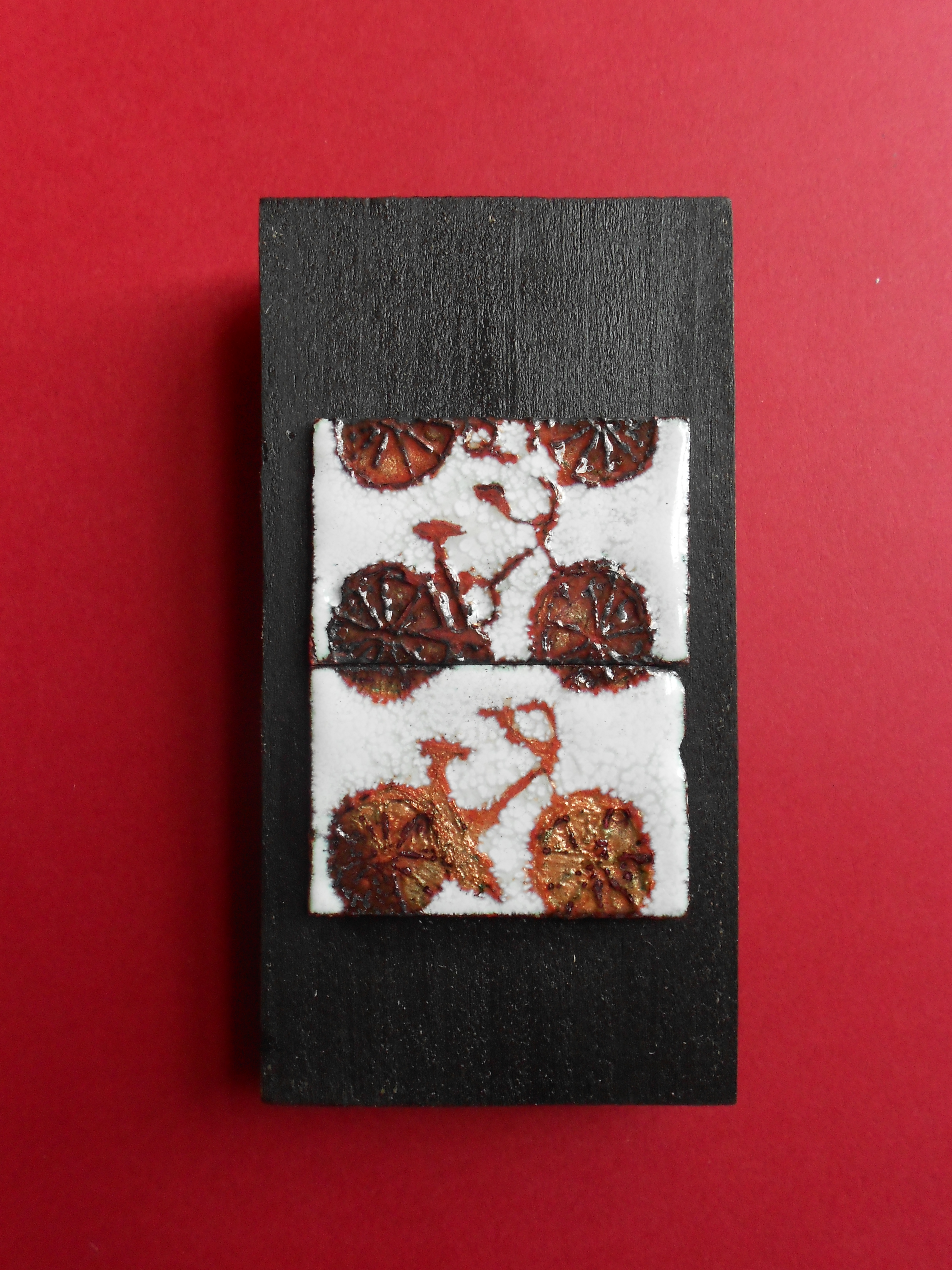 I work with a variety of materials, primarily sterling silver, fine silver and brass. Techniques I use include enameling, casting, hand fabriction.